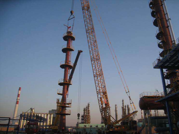 中午12:08隨著鞭炮響起,四座塔的吊裝正式開始。至下午17:00脫異丁烷塔、脫正丁烷塔雙塔正式安裝完成,12月30日脫輕烴塔、水洗塔安裝完畢。