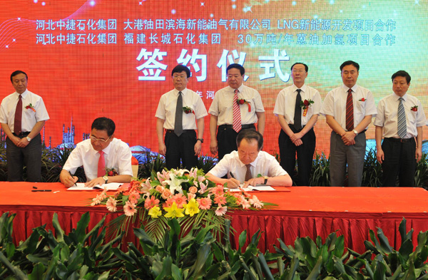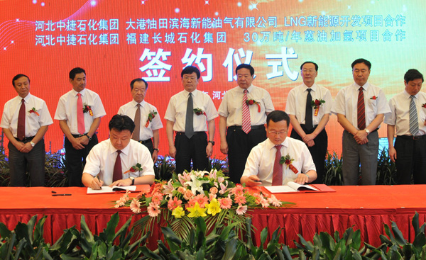 當(dāng)天簽約的兩個(gè)項(xiàng)目分別是中捷石化集團(tuán)與大港油田濱海新能油氣有限公司LNG新能源開發(fā)項(xiàng)目合作協(xié)議、中捷石化與福建長(zhǎng)城石化集團(tuán)有限公司30萬噸/年蒽油加氫項(xiàng)目合作協(xié)議。