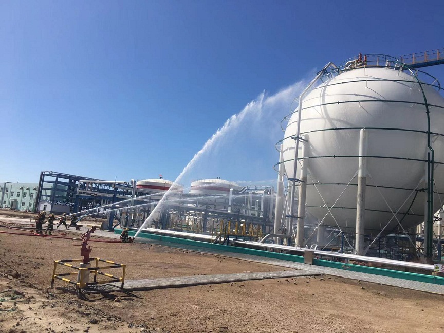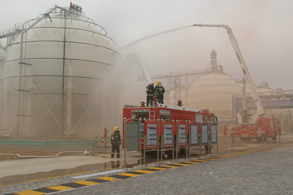 本次演練模擬丙烯球罐根部法蘭泄漏著火,通過采取現(xiàn)場消防應(yīng)急措施進行自救無法控制,請求政府支援。經(jīng)過現(xiàn)場緊急處置及企業(yè)消防隊、政府有關(guān)單位的支援,成功將火勢控制。