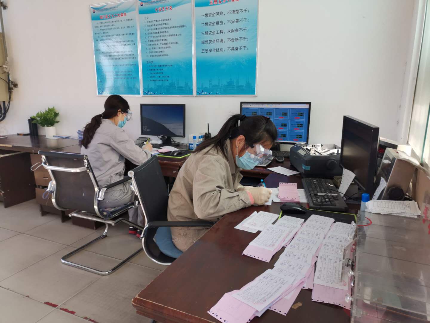 工作中,她們不僅要做好自身防護(hù),還要督促司機(jī)進(jìn)廠后做好相關(guān)防護(hù)。她們自己錄制了疫情防控溫馨提示,告知司機(jī)疫情期間的注意事項(xiàng)和工作流程。面對(duì)司機(jī)們偶爾的不理解,就面帶微笑耐心的反復(fù)解釋說(shuō)明,她們知道越是這種時(shí)刻越不能掉以輕心,越要做好服務(wù)。正是因?yàn)樗齻兊娜母冻霰WC了收發(fā)系統(tǒng)的平穩(wěn)運(yùn)行,在疫情防控的關(guān)鍵時(shí)刻地磅房沒(méi)有出現(xiàn)任何問(wèn)題。