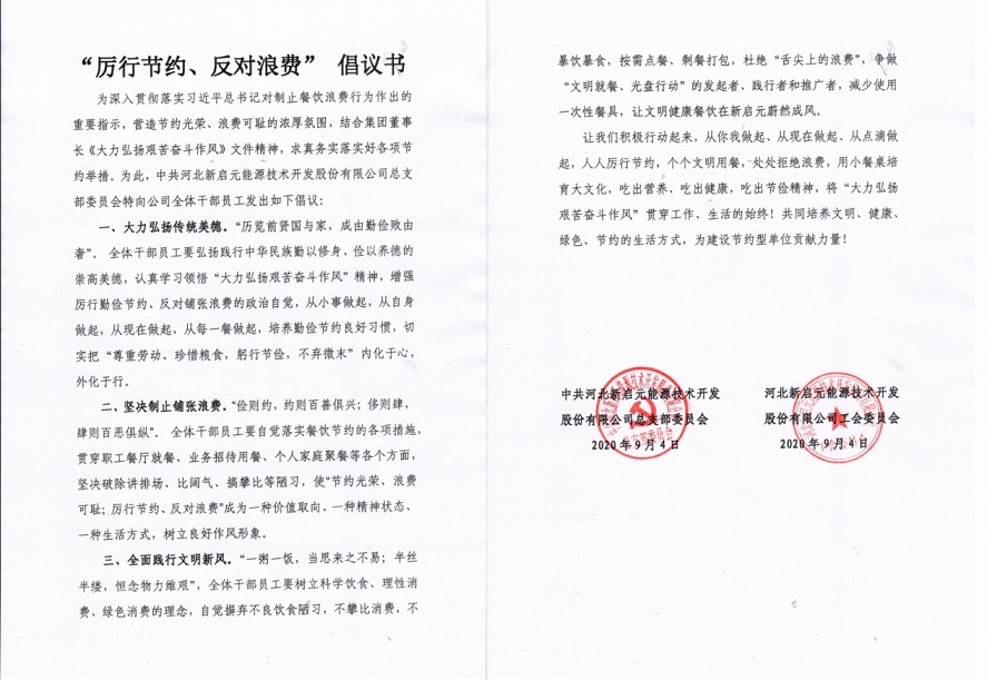 新啟元黨總支、新啟元工會組織全體職工簽訂了《厲行節(jié)約、反對浪費》倡議書。倡議全體職工要從自身做起,從點滴做起,積極營造“節(jié)約光榮、浪費可恥”的氛圍,堅決制止餐飲浪費行為。