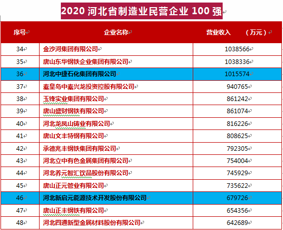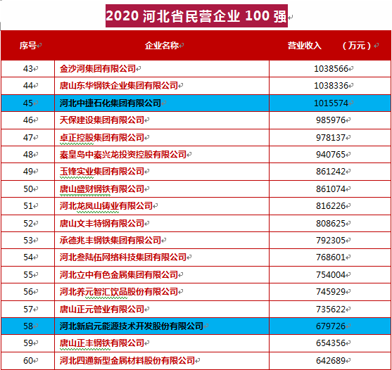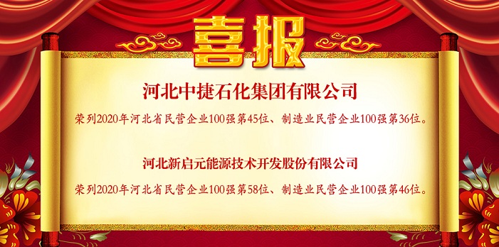 新啟元公司訊(通訊員 王世明)9月25日,河北省民營企業(yè)百強(qiáng)暨民營企業(yè)社會(huì)責(zé)任報(bào)告發(fā)布會(huì)上,河北省工商聯(lián)發(fā)布了2020年河北省民營企業(yè)100強(qiáng)榜單、制造業(yè)100強(qiáng)榜單、服務(wù)業(yè)100強(qiáng)榜單。河北中捷石化集團(tuán)有限公司、河北新啟元能源技術(shù)開發(fā)股份有限公司榜上有名。