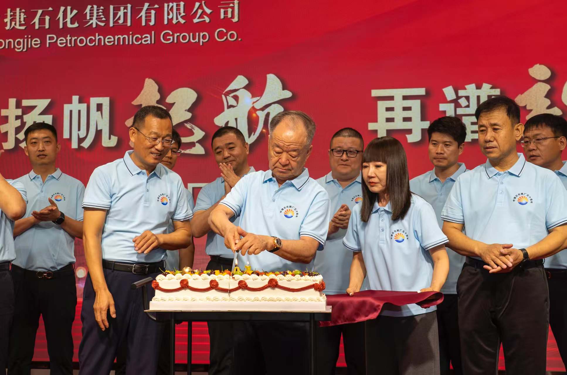 隨后,在溫馨而莊重的氛圍中,集團(tuán)董事長(zhǎng)王振華,黨委書記于國(guó)臣,總經(jīng)理喬樹華等集團(tuán)公司領(lǐng)導(dǎo),各所屬單位董事長(zhǎng)、總經(jīng)理共同上臺(tái),全場(chǎng)齊唱生日歌,為中捷石化50歲生日獻(xiàn)上最美好的祝福。